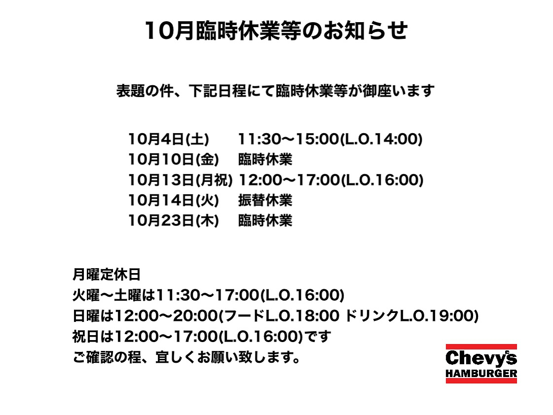 10月臨時休業等のお知らせです10月臨時休業等のお知らせです ご確認のほど、宜しくお願いいたします